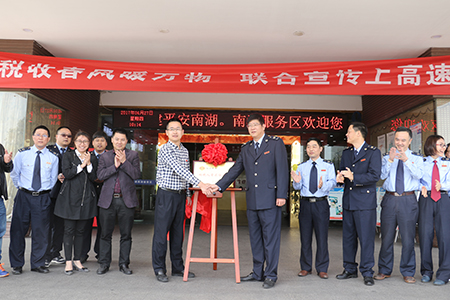 揭牌現場,高速管理公司與南湖區國稅局、市地稅局第一稅務分局工作人員們聯合開展了“稅收春風暖萬物,聯合宣傳上高速”稅收宣傳活動,將稅收宣傳帶上了高速。工作人員熱情地向過往司乘發放稅收宣傳冊,耐心地講解營改增之后如何使用通行費抵扣進項稅等稅務政策,引導廣大司乘通過掃描宣傳冊上的二維碼關注微信或下載APP了解相關涉稅知識。