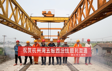 西汾線分離橋位于杭州灣北接線二期主線K22處,是TJ05標段最后一座跨主線分離式橋梁,上部結構采用裝配式小箱梁,全長500.4米,橋梁總寬8米,共66片25m小箱梁。該橋梁的架通,也標志著在灣北二期項目TJ05標共1068片梁板全部安裝完成,施工重心由主體工程收尾轉入橋面系及其附屬工程收關階段,按計劃完成重要節點的施工,全力推進項目攻堅戰活動,為完成全線的施工建設任務打下堅實的基礎。