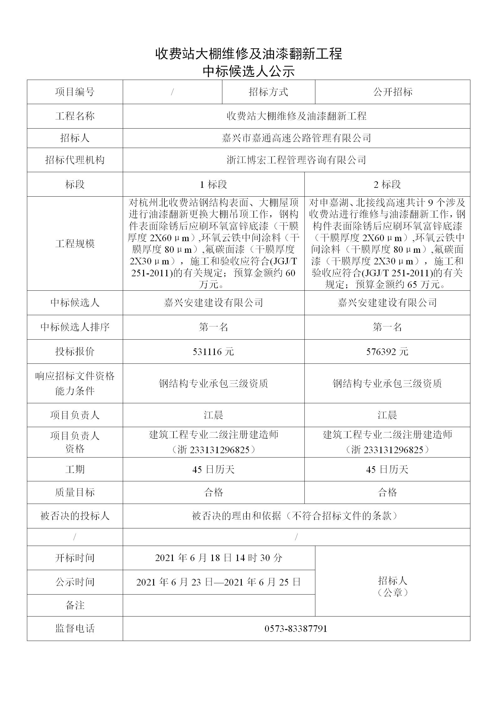 收費站大棚維修及油漆翻新工程中標候選人公示