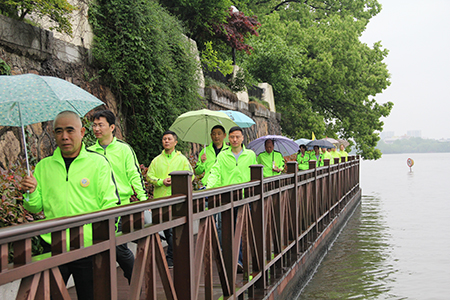上午9點半,來自各單位的百余名職工齊聚在南湖會景園,盡管當天天公不作美,淅淅瀝瀝下著雨,但大家熱情不減,風雨無阻,一個個齊刷刷邁開步伐,精神飽滿地投入到環南湖健步走活動中。統一的著裝、鮮艷的旗幟,形成了一道道亮麗的風景線,吸引了諸多市民的駐足觀望。