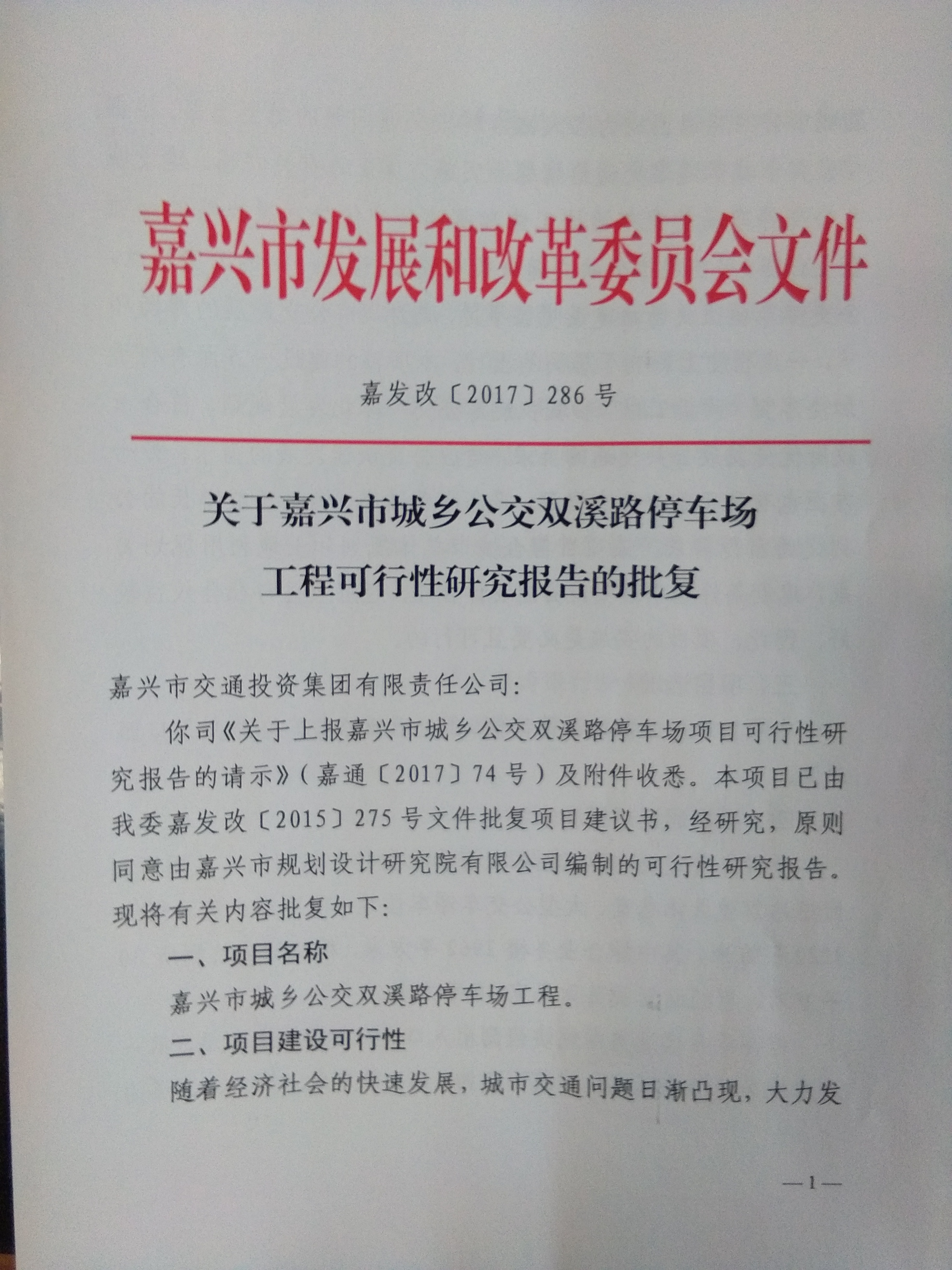 嘉興市城鄉公交雙溪路停車場工程可行性研究報告的批復