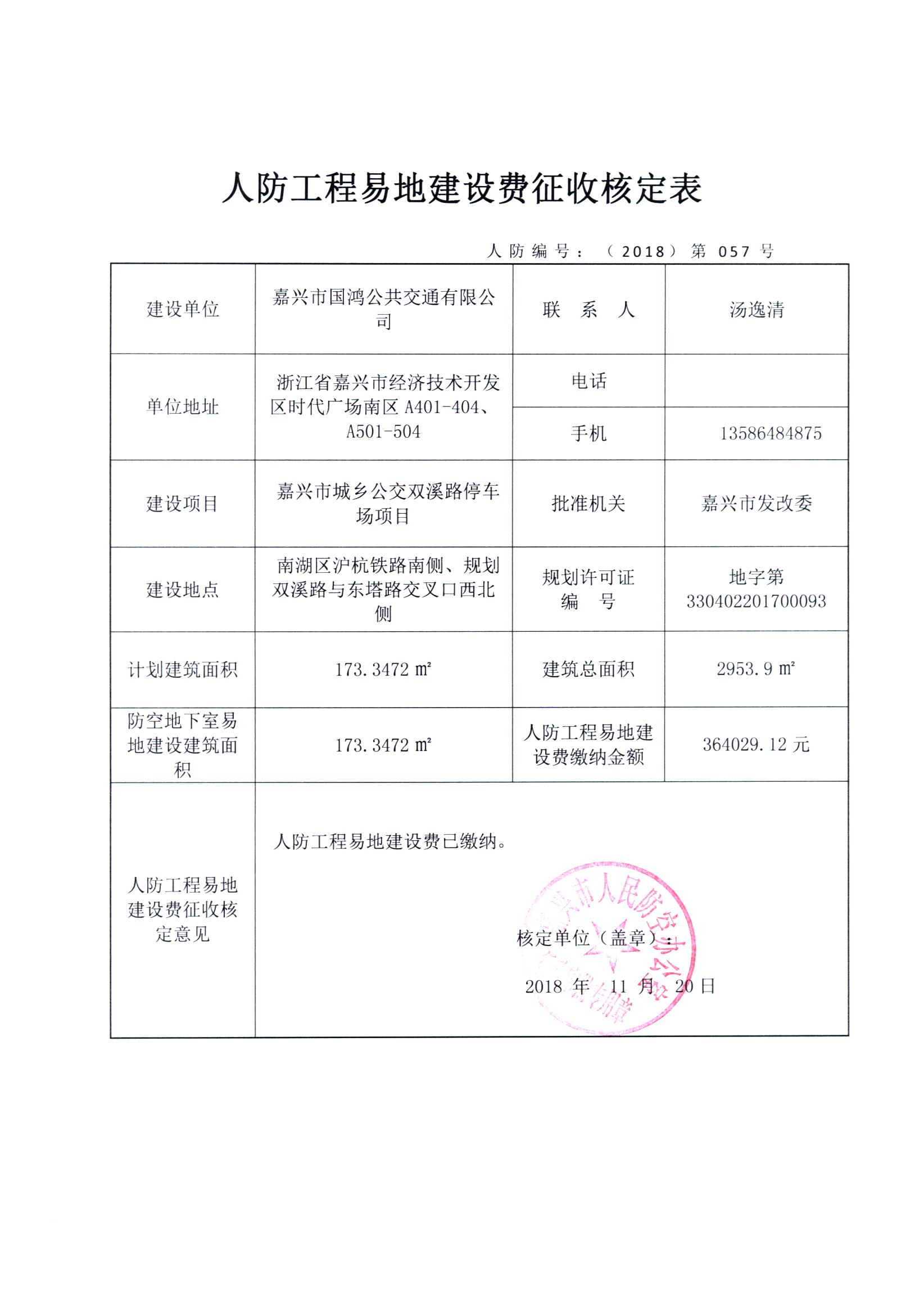 嘉興市城鄉公交雙溪路停車場工程人防許可